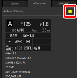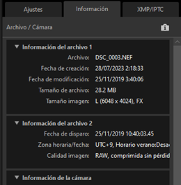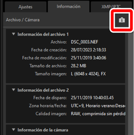 - Muestra información de la imagen y ajustes de las imágenes seleccionadas.