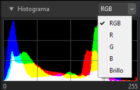 El histograma de la imagen actual. Para ver u ocultar el histograma, haga clic en el botón