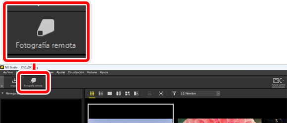 Si está instalado, se puede iniciar NX Tether haciendo clic en [Fotografía remota] en la barra de herramientas.