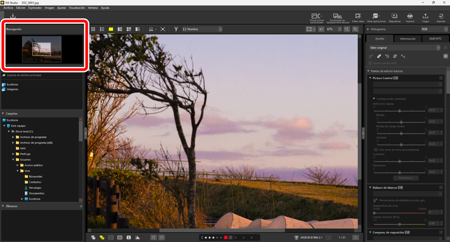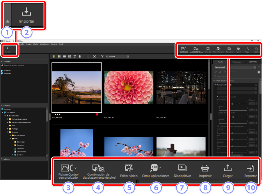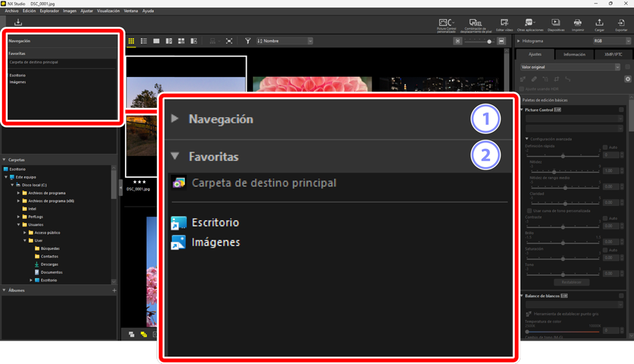 - [Abra el archivo de imagen original sin cambios (no se aplican ajustes)]: Los archivos se abren en sus formatos originales. Las mejoras realizadas en NX Studio no se aplicarán.
