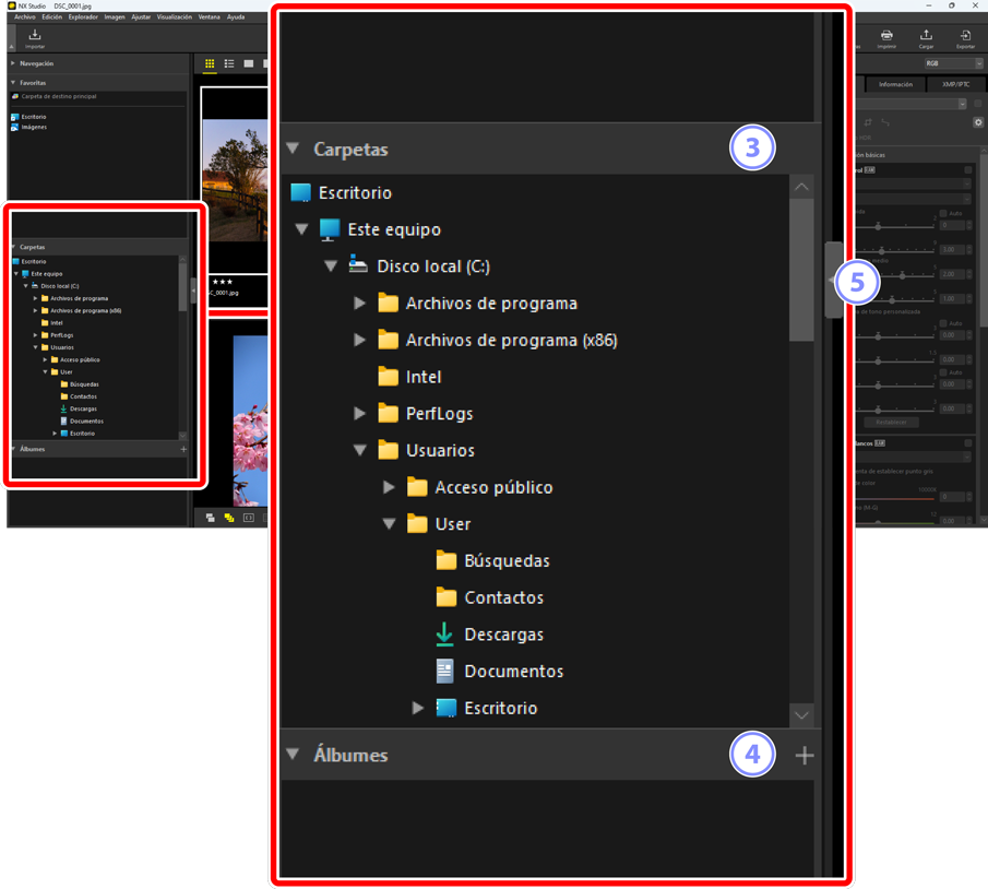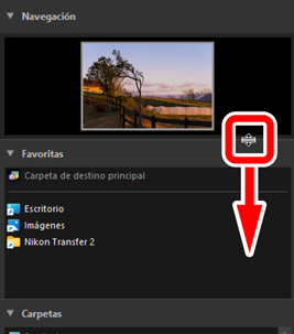 Arrastre los bordes entre las subpaletas [Navegación], [Favoritas], [Carpetas] y [Álbumes] para ajustar su tamaño.