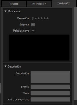 Edite metadatos XMP/IPTC, incluyendo etiquetas y valoraciones. Los cambios en las etiquetas y las valoraciones en el área de visualización o en el menú [Imagen] se reflejan en la ficha [XMP/IPTC].