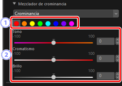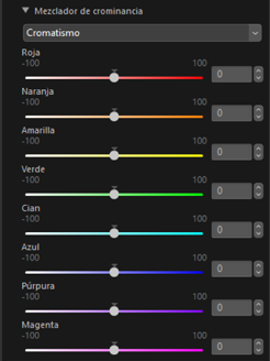 Ajuste el cromatismo (saturación) para cada color. Esta opción también refleja el resultado de dicho ajuste si ajustó [Cromatismo] en [Crominancia].