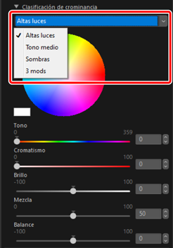 Ajuste los tonos de las altas luces, los medios tonos y las sombras con [Tono] y [Cromatismo], o del brillo con [Brillo]. Seleccione colores intuitivamente con la rueda de colores.