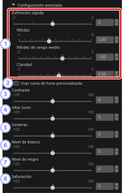 - [Nitidez de rango medio]: Aplique nitidez a zonas de contraste mayores que aquellas afectadas por [Nitidez] y más pequeñas que aquellas afectadas por [Claridad].
