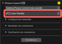 - Los Picture Control personalizados basados en [Color Flexible] no se pueden ajustar en la cámara.