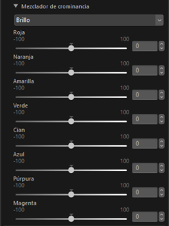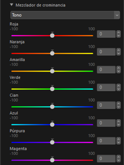 Ajuste el cambio de tono para ocho colores diferentes en la imagen. Los ajustes pueden realizarse en los canales de [Crominancia], [Tono], [Cromatismo] y [Brillo]. Las opciones disponibles varían según el canal seleccionado.