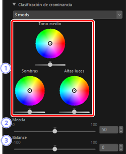 Ajuste el cambio de tono y el brillo de las altas luces, los tonos medios y las sombras. Seleccione el color que se aplicará en la rueda de colores y los controles deslizantes del [Tono] y [Cromatismo].