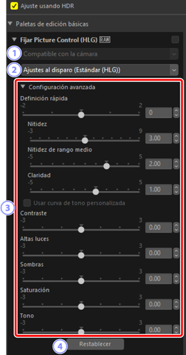 Habilitar o deshabilitar [Ajuste usando HDR] restaura todos los ajustes de los Picture Control.