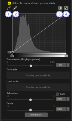 - Ajuste el contraste de la imagen en general. Elija valores más bajos para reducir el contraste, valores más altos para aumentarlo. Este parámetro no puede ajustarse si la imagen ha sido ajustada con una curva de tonos personalizada.