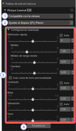 Seleccionar imágenes capturadas con una cámara usando los últimos Picture Control (la opción del proceso de reproducción del color fijada en [Compatible con la cámara]) o imágenes con el proceso de reproducción del color ajustado en [Sistema Picture Control más reciente] muestra los parámetros siguientes. Si selecciona [Color Flexible] como la opción del Picture Control, consulte “La herramienta de Picture Control (Color Flexible)” (0 La herramienta de Picture Control (Color Flexible)).