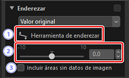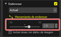 Enderezar las imágenes añade zonas sin datos de imagen. Bajo los ajustes predeterminados, las imágenes se recortarán automáticamente para eliminar las esquinas vacías. Seleccionar [Incluir áreas sin datos de imagen] rellena de negro las esquinas vacías.