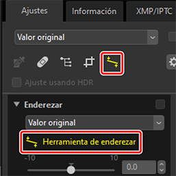 ) la herramienta de enderezar. También puede hacer clic en el icono de la herramienta en la parte superior de la paleta de ajustes.
