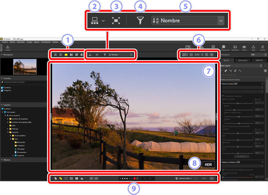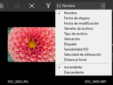 - Seleccione cómo se visualizarán las imágenes en el visor. Tiene la opción de seleccionar no solo las vistas de miniaturas y de fotograma a fotograma, sino también de comparar imágenes en paralelo (0 Elegir un modo de vista).