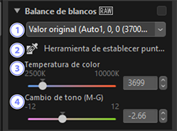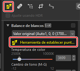 Ajuste el balance de blancos. Tenga en cuenta que esta herramienta solo está disponible con imágenes RAW e imágenes con desplazamiento de píxel combinadas.