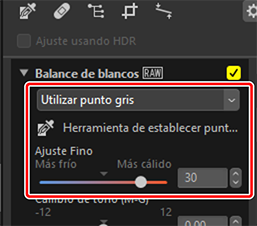 Cuando [Utilizar punto gris] aparezca en el menú del balance de blancos, [Temperatura de color] cambiará a [Ajuste Fino] y el balance de blancos se podrá ajustar con precisión usando el control deslizante.