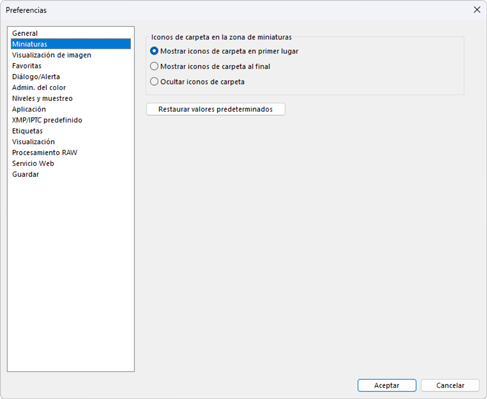 Seleccione si las subcarpetas aparecerán en la cuadrícula de miniaturas, en la lista de miniaturas y en la tira de diapositivas y en qué orden.