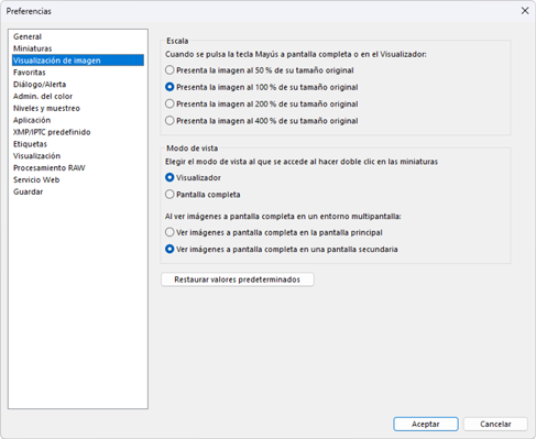 - [Elegir el modo de vista al que se accede al hacer doble clic en las miniaturas]: Seleccione si hacer doble clic en una miniatura en la cuadrícula de miniaturas o en la lista de miniaturas muestra la imagen a pantalla completa o en el visualizador.