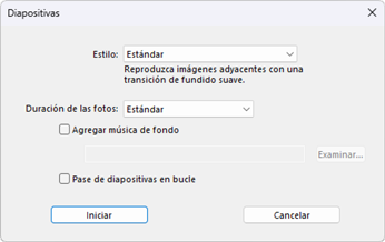 Las opciones del cuadro de diálogo [Diapositivas] controlan durante cuánto tiempo se muestran las imágenes, las transiciones entre diapositivas y otros ajustes del pase de diapositivas. Después de ajustar la configuración, haga clic en [OK] para iniciar el pase.