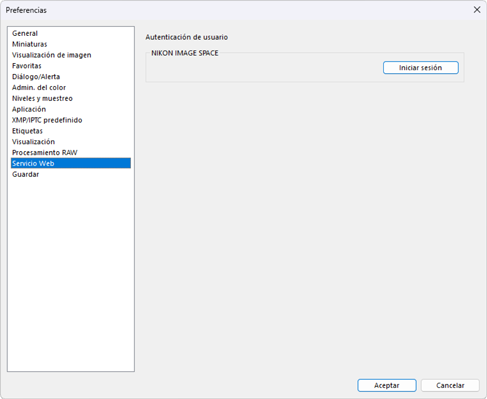 Para cargar imágenes, primero debe iniciar sesión en NIKON IMAGE SPACE. Introduzca su información de inicio de sesión en la sección [Servicio Web] del cuadro de diálogo de preferencias (0 El cuadro de diálogo de preferencias, [Servicio Web]).
