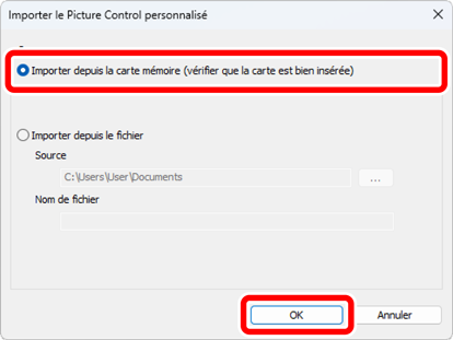 Dans la boîte de dialogue [Importer le Picture Control personnalisé], choisissez [Importer depuis la carte mémoire (vérifier que la carte est bien insérée)] et cliquez sur [OK].