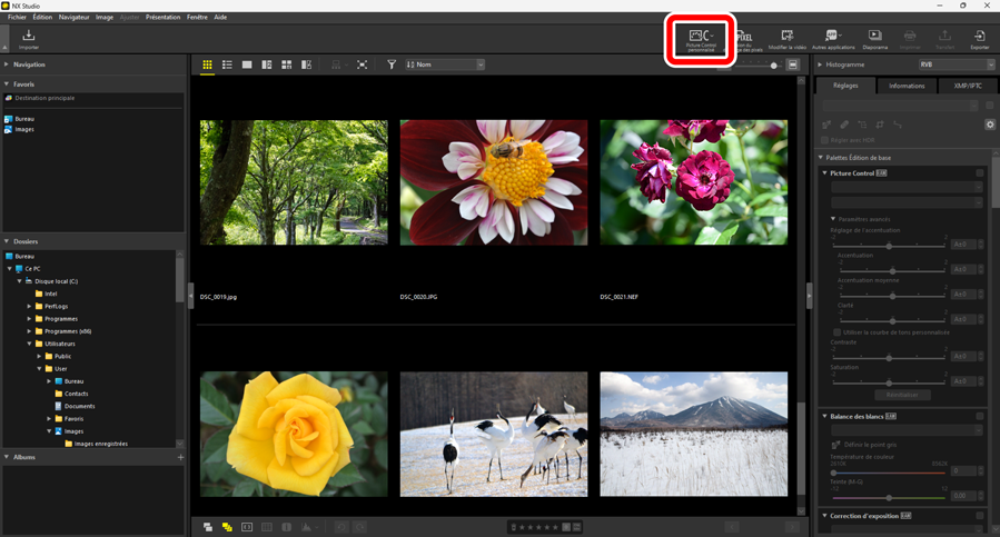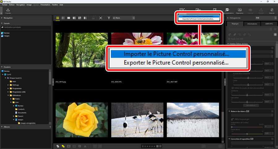 En cliquant sur le bouton [Picture Control personnalisé] dans la barre d’outils, vous pouvez importer des fichiers de Picture Control personnalisé depuis l’appareil photo ou le logiciel et les sauvegarder dans NX Studio, ainsi qu’utiliser [Picture Control] dans la palette de réglages de NX Studio pour exporter les Picture Control personnalisés en tant que fichiers.