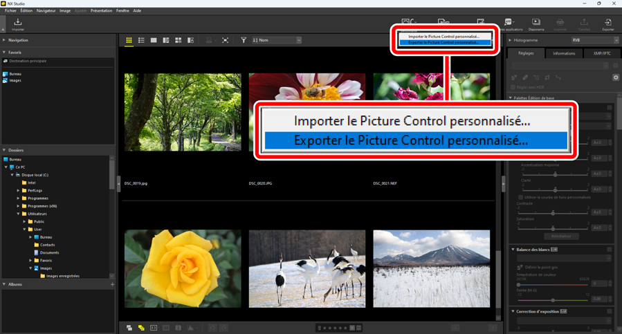 Les Picture Control personnalisés enregistrés dans NX Studio peuvent être exportés en tant que fichiers.