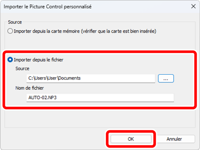 Il existe deux manières de choisir un fichier à importer : entrez l’emplacement du fichier de Picture Control personnalisé dans [Source], puis entrez le nom de fichier dans [Nom de fichier], ou cliquez sur l’icône