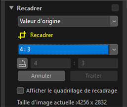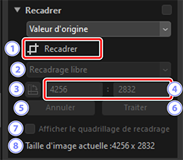 - Dimensions du recadrage actuel. Pour saisir les dimensions directement dans les zones de texte, sélectionnez [Personnaliser] dans le menu déroulant des proportions.