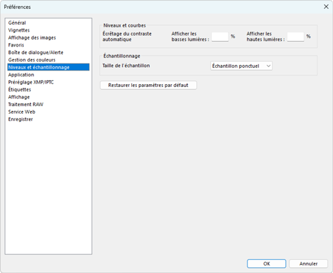 Les paramètres de cette catégorie s'appliquent aux outils [Niveaux et courbes] et aux outils d'échantillonnage.