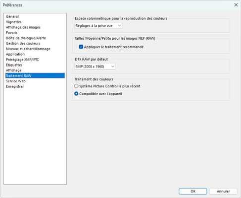 - Choisissez l'espace colorimétrique utilisé pour régler les photos RAW.