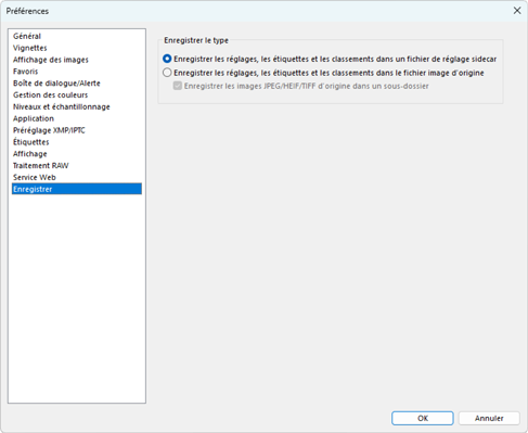 Choisissez la méthode d'enregistrement des photos. Les réglages d'image effectués dans NX Studio peuvent être enregistrés dans des fichiers « sidecar » ou appliqués directement aux photos.