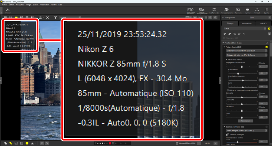 ) cet outil pour afficher le nom de l'appareil photo, la date d'enregistrement et d'autres informations sur les images dans la visionneuse.
