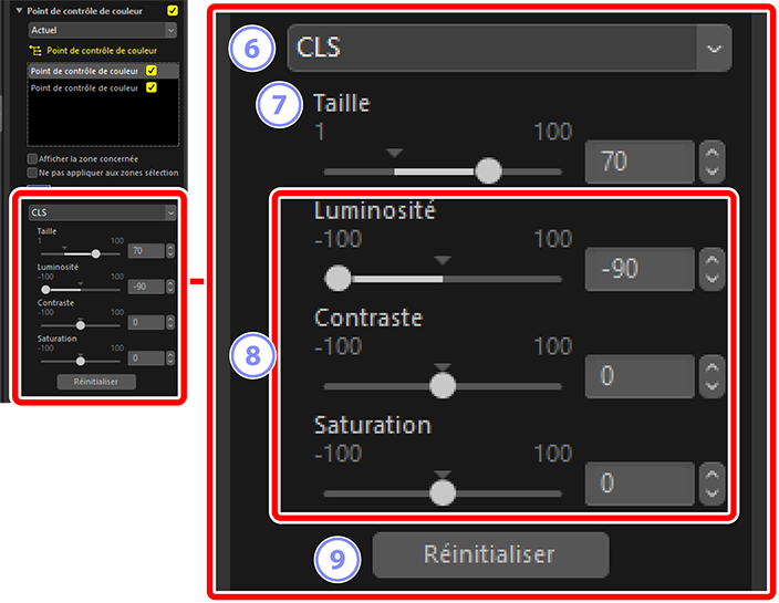 - Désactivez les curseurs de réglage du point de contrôle sélectionné. Cela empêche également les modifications apportées aux autres points de contrôle d'affecter les couleurs de la zone sélectionnée. Vous pouvez modifier la taille de la zone protégée à l'aide du curseur de taille.