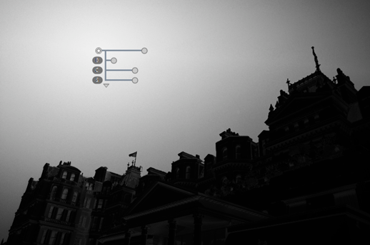 Faites glisser les poignées des curseurs de réglage vers la gauche ou la droite pour régler la couleur sélectionnée. L'illustration représente le curseur [B] (luminosité), utilisé ici pour régler la luminosité du ciel. La couleur du bâtiment n'est pas modifiée car l'effet s'applique uniquement au bleu du ciel. Cet effet diminue au fur et à mesure que l'on s'éloigne du point de contrôle.