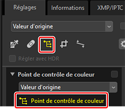 ) l'outil Point de contrôle de couleur. Vous pouvez également cliquer sur l'icône de l'outil, située en haut de la palette Réglages.