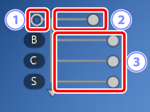 ). - Les curseurs de réglage par défaut sont [B] (luminosité), [C] (contraste) et [S] (saturation).
