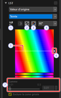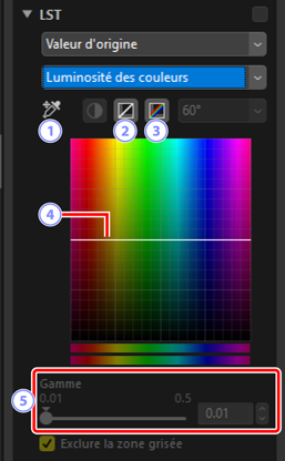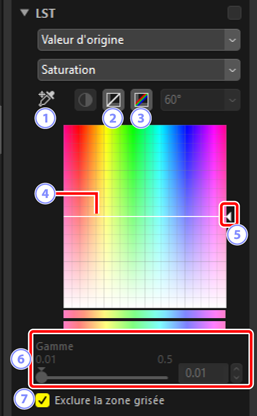 Effectuez des réglages sur les canaux de luminosité, saturation et teinte. Choisissez un canal à l'aide du menu de l'outil LST. Les options disponibles varient selon le canal sélectionné. L'outil LST ne s'affiche pas lorsque [Régler avec HDR] est activé.