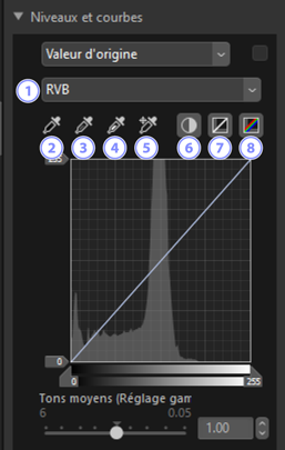 - Cliquez sur ce bouton, puis cliquez sur la photo pour sélectionner les couleurs du pixel situé sous le curseur. Le gamma des canaux [Rouge], [Vert] et [Bleu] sera réglé pour égaliser les valeurs RVB du pixel sélectionné.
