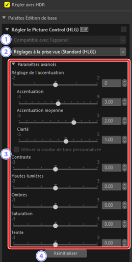 Réglez les paramètres Picture Control pour la plage de tons HDR. Notez que cet outil est uniquement disponible avec les photos RAW ou les photos avec fusion du décalage des pixels prises lorsque HLG est activé sur les appareils photo permettant de sélectionner le mode de tons.