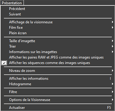 - Affichez chaque paire de photos prises au format RAW + JPEG ou RAW + HEIF comme une image unique en modes d'affichage Vignettes et Film fixe.