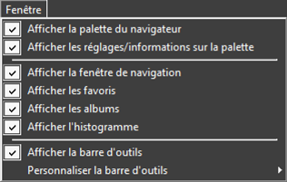 - [Afficher la palette du navigateur]/[Afficher les réglages/informations sur la palette]/[Afficher la fenêtre de navigation]/[Afficher les favoris]/[Afficher les albums]/[Afficher l'histogramme]