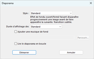 Les options de la boîte de dialogue [Diaporama] permettent de régler la durée d'affichage des photos, les transitions entre les images et d'autres paramètres du diaporama. Après avoir modifié les réglages, cliquez sur [OK] pour démarrer le diaporama.