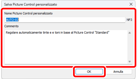 Nella finestra di dialogo [Salva Picture Control personalizzato], denominare il Salva Picture Control personalizzato, aggiungere un commento, quindi fare clic su [OK].