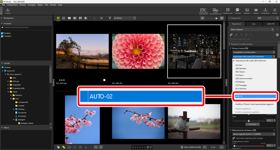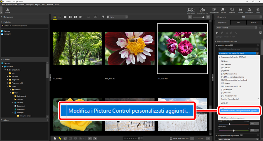 Fino a 150 Picture Control personalizzati possono essere aggiunti a NX Studio.