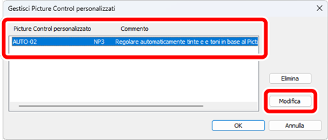 Nella finestra di dialogo [Gestisci Picture Control personalizzati], selezionare un Picture Control personalizzato e fare clic su [Modifica].