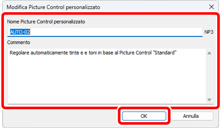 Nella finestra di dialogo [Modifica Picture Control personalizzato], denominare il Picture Control personalizzato, aggiungere un commento, quindi fare clic su [OK].
