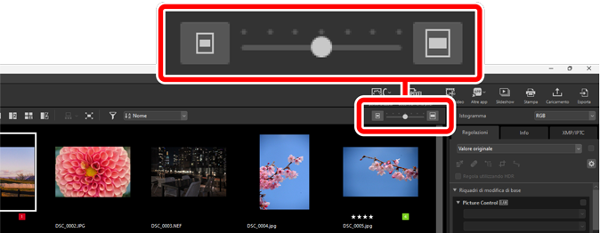 Le dimensioni delle miniature nei display elenco e griglia possono essere regolate utilizzando il cursore nell'angolo in alto a destra dell'area di visualizzazione. Far scorrere il cursore a destra per aumentare le dimensioni miniature.