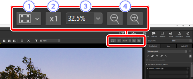 Utilizzare i pulsanti nell'angolo in alto a destra dell'area di visualizzazione per scegliere le dimensioni di visualizzazione per le immagini nei display visualizzatore foto, "2/4 immagini" e Prima e dopo.