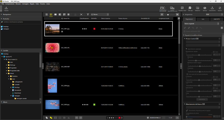 Elencare le foto in cartelle selezionate. Le foto possono essere ordinate per nome file, etichetta o altri criteri.
